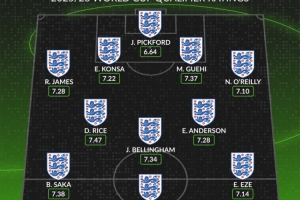 全文摘要:英格蘭世預賽8戰全勝晉級世界杯。WhoScored評選出最高評分陣容,凱恩以7.96分居首,賴斯(7.47)和薩卡(7.38)緊隨其后。該陣容包括門將皮克福德,后衛詹姆斯、孔薩、格伊、奧萊利,中場賴斯、貝林厄姆、埃澤、安德森,以及前鋒薩卡與凱恩。