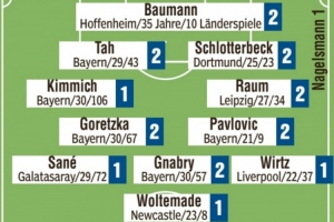后衛:基米希(1)、若納坦-塔(2)、施洛特貝克(2)、勞姆(2)