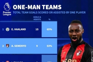 全文摘要:德國轉會市場統計了英超球員本賽季參與進球占球隊總進球的比例。哈蘭德以15球、65%的占比高居榜首,伯恩茅斯的塞梅尼奧以9球、53%的占比緊隨其后。布倫特福德的伊戈爾·蒂亞戈、紐卡的吉馬良斯和水晶宮的馬特塔也位列前五,占比分別為47%、46%和43%。