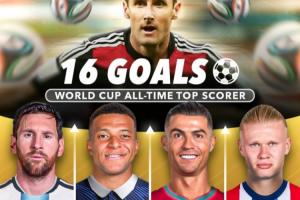 目前世界杯歷史射手王是克洛澤,他在隨德國隊參加的4屆世界杯中打進16球,超越了15球的羅納爾多。現役球員中,已經打進13球的梅西與12球的姆巴佩,明年世界杯均有機會超越克洛澤,而8球的凱恩、C羅、內馬爾難度則比較大。