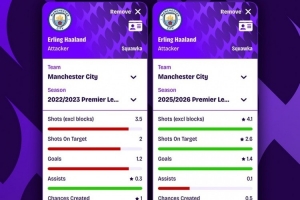 全文摘要:根據Squawka統計,哈蘭德本賽季英超數據全面優于上賽季。其每90分鐘射門、射正、進球及爭頂成功率均有提升,創造機會和助攻則有所下降。總體表現更為高效,進攻火力持續增強。
