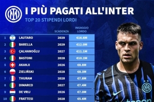 全文摘要:根據德國轉會市場數據,國米球員稅前年薪榜出爐。勞塔羅以1660萬歐高居第一,巴雷拉(1200萬歐)和恰爾汗奧盧(1100萬歐)分列二、三位。巴斯托尼(1020萬歐)、阿坎吉(880萬歐)等球員也位列榜單前列,詳細薪資與合同年限均已公布。