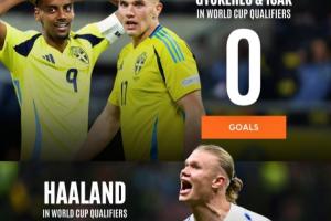 體育資訊11月18日訊 歐洲區世預賽已經接近尾聲,哈蘭德率領的挪威8戰全勝挺進世界杯,他本人更是8場16球領跑射手榜,與另一支擁有豪華鋒線的球隊瑞典形成了鮮明反差。