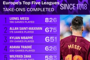 全文摘要:根據Squawka統計,自17-18賽季以來,五大聯賽球員成功過人次數排名中,梅西以826次高居榜首。圣馬克西曼(675次)和姆巴佩(651分)分列二、三位。該榜單展示了近幾個賽季球員在盤帶能力上的出色表現。