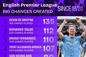 體育資訊11月19日訊 Squawka統計了2019-2020賽季以來球員在英超創造重大機會的次數,并列出榜單,德布勞內、薩拉赫、B費排名前三位。