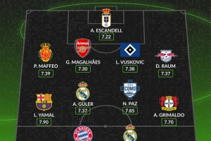 全文摘要:WhoScored根據本賽季場均評分,公布了五大聯賽最佳陣容。該陣容包括門將埃斯坎德爾,后衛馬菲奧、加布里埃爾等,中場/邊鋒有亞馬爾、居萊爾、格里馬爾多等鋒線好手,鋒線則由拜仁的凱恩和皇馬的姆巴佩領銜。