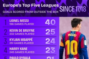 全文摘要:Squawka統計顯示,自17-18賽季以來,五大聯賽禁區外遠射進球榜中,梅西以196場40球高居榜首,德布勞內(232場25球)和姆巴佩(251場24球)分列二、三位。該榜單凸顯了頂級球員在禁區外的得分能力。