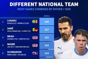 全文摘要:德國轉會市場統計了足壇父子代表不同國家隊的出場次數榜單。布馮之子路易斯在捷克U19表現優異,有望入選成年隊,父子合計出場次數待定。目前,盧卡庫父子以135場居首,薩內(127場)、維阿與納比(122場)緊隨其后。