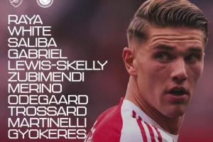 阿森納vs紐卡首發:1-拉亞、3-莫斯克拉、6-加布里埃爾、12-廷伯、33-卡拉菲奧里、36-蘇維門迪、41-賴斯、10-埃澤、7-薩卡、14-約克雷斯、19-特羅薩德