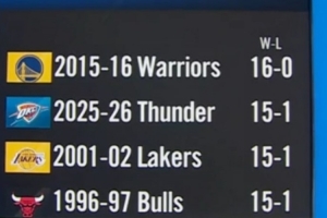 值得注意的是,過去30年開賽季前16場至少15勝的衛冕冠軍中,2001-02賽季的湖人(15勝1負)和1996-97賽季的公牛(15勝1負)都奪冠了。