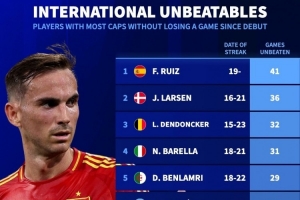 全文摘要:據德國轉會市場統計,本世紀球員國家隊連續不敗場次榜單出爐。西班牙球員法比安·魯伊斯以41場不敗高居榜首,丹麥的拉爾森以36場次之,比利時的登東克爾和意大利的巴雷拉分別以32場和31場位列三、四位。