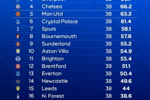 天空體育預測本賽季英超最終排名(積分為模擬10萬次的平均值)