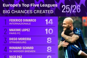 體育資訊11月21日訊 Squawka統計了本賽季球員在五大聯賽創造重大機會的次數,并列出榜單,迪馬爾科創造14次重大機會最多。