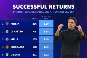 全文摘要:德國轉會市場統計了教練執教球員時代英超老東家的場均積分。阿爾特塔以1.99分高居榜首,迪馬特奧以1.98分緊隨其后。維亞利、索爾斯克亞等前切爾西和曼聯名宿也位列榜單前列,展現了他們作為球員和教練的雙重成功。