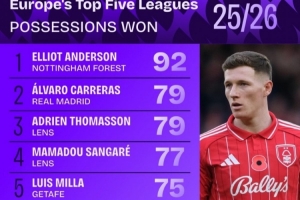 體育資訊11月22日訊 五大聯賽戰火即將重燃,數據機構squakwa也統計了本賽季至今的五大聯賽球員贏得球權次數情況,諾丁漢森林中場埃利奧特·安德森居首。