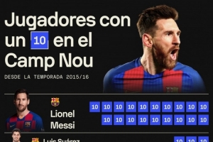全文摘要:根據Sofascore統計,2015-16賽季以來,球員在諾坎普獲評10分的場次中,梅西以19場居首。蘇亞雷斯與內馬爾并列第二,各3場;圖蘭、姆巴佩、登貝萊和萊萬均以1場并列第三。