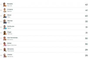 歐冠歷史助攻榜前十(數據來自歐冠官網)