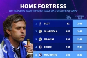 全文摘要:英超執教單一俱樂部主場場均得分榜公布。利物浦主帥斯洛特以場均2.48分高居榜首,瓜迪奧拉(曼城)以2.47分緊隨其后。穆里尼奧(切爾西)和弗格森(曼聯)分列第五和第六位。該榜單統計了至少執教25場的主場戰績。