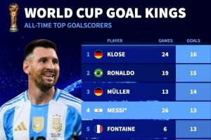 全文摘要:2026年世界杯用球“三重浪”已發布。世界杯歷史射手榜前十中,克洛澤以16球居首,羅納爾多、蓋德-穆勒緊隨其后。現役球員梅西(26場13球)和姆巴佩(14場12球)也躋身前十。