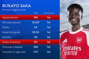 全文摘要:阿森納球星薩卡將迎來英超200場里程碑。據天空體育統計,自他首秀以來,其出場、進球、助攻等多項數據均位列隊內同期第一,充分展現了他作為球隊核心的關鍵作用與持續穩定的高水平表現。