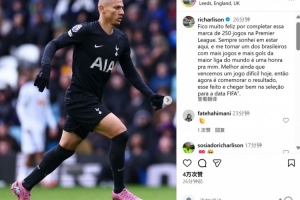 全文摘要:熱刺2-1勝利茲聯,理查利森替補達成英超250場里程碑。他社媒曬照慶祝,稱能在此踢球是榮幸,并渴望成為頂級聯賽出場最多的巴西球員之一。他更高興球隊艱難取勝,將慶祝并迎接國家隊比賽日。