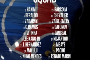 全文摘要:法甲第7輪,巴黎圣日耳曼客場挑戰里爾。球隊公布了大名單,登貝萊、馬爾基尼奧斯等6名主力球員缺席。門將舍瓦利耶領銜,阿什拉夫、努諾-門德斯等球員在列,前鋒線由貢薩洛-拉莫斯和李剛仁擔綱。