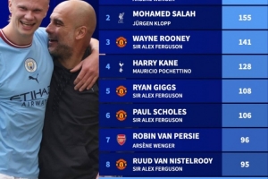全文摘要:德國足球轉會網站盤點單一主帥治下球員進球榜。亨利在溫格麾下的阿森納以175球高居榜首。薩拉赫(155球)、魯尼(141球)和凱恩(128球)分列二至四位。榜單中,弗格森時代的曼聯球員占據四席,瓜迪奧拉手下的哈蘭德以94球位列第九。