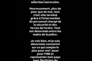 “幸運的是,驚嚇大于傷害,事件在安保人員和執法部門的及時介入下迅速平息。目前一切已交由警方處理。我現在很好,也已將注意力重新放在最重要的事情上:為馬賽效力,并在即將到來的國家隊集訓中自豪地代表祖國出戰。”