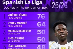 全文摘要:Squawka統計顯示,本賽季西甲禁區觸球次數排行中,皇馬的維尼修斯以76次位居榜首,隊友姆巴佩以64次次席。巴薩的拉什福德與比利亞雷亞爾的佩佩并列第三,均有50次。此數據直觀反映了球員在前場的活躍度與進攻參與度。