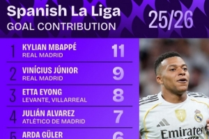 全文摘要:Squawka統計顯示,皇馬前鋒姆巴佩以參與11球(進球+助攻)領跑本賽季西甲射手榜。巴薩的維尼修斯以9球位居次席,萊萬特/比利亞雷亞爾的艾永和馬競的阿爾瓦雷斯分列三、四位。該榜單展現了西甲球員的進攻貢獻,姆巴佩表現尤為突出。