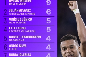 全文摘要:根據Squawka統計,本賽季西甲射手榜上,皇馬前鋒姆巴佩以9球高居榜首。馬競的阿爾瓦雷斯以6球位列第二,皇馬的維尼修斯與艾永同以5球并列第三。萊萬的巴薩隊友費蘭-托雷斯等五名球員均打入4球,共同排在第五位。
