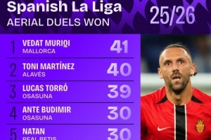 全文摘要:Squawka統計了本賽季西甲爭頂成功次數,馬洛卡的穆里奇以41次位居榜首。皇馬中衛赫伊森21次,位列第八。奧薩蘇納球員表現搶眼,共有三人進入前十。