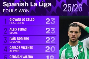 全文摘要:Squawka統計顯示,本賽季西甲被犯規次數排行出爐。貝蒂斯洛塞爾索以23次居首,費巴斯并列。埃爾切、萊萬特、阿拉維斯等隊球員緊隨其后。馬競小將朱利亞諾-西蒙尼以18次與多人并列第五,遭遇對手重點“照顧”。