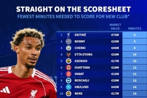 全文摘要:德國轉會市場統計了今夏新援的最快處子球榜單。利物浦前鋒埃基蒂克以驚人的4分鐘拔得頭籌,國米新援博尼以5分鐘緊隨其后。該榜單收錄了德轉身價超1000萬歐的新援,展現了他們高效的即戰力。