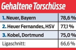 全文摘要:《體育圖片報》統計了本賽季德甲門將撲救成功率,拜仁39歲老將諾伊爾以78.6%高居榜首,遠超聯賽平均的66.6%。漢堡的霍伊爾-費爾南德斯(77.1%)和多特的科貝爾(75%)分列二、三位,展現了頂級門神的出色表現。