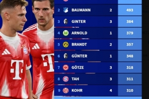 德甲現役球員出場數排行:諾伊爾527場居首,基米希、磁卡進前10