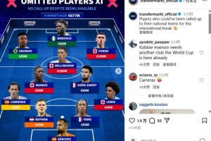 體育資訊10月11日訊 德轉列出落選本期國家隊的最貴陣容,總價高達6.77億歐。