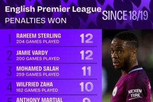 全文摘要:根據Squawka統計,自2018-19賽季以來,斯特林與瓦爾迪以12次造點次數并列英超榜首,薩拉赫以11次位列第三。扎馬、馬夏爾等球員也榜上有名,該榜單反映了特定球員在英超制造點球機會的能力。