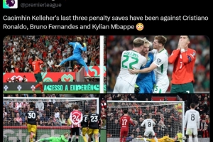 全文摘要:英超官方數據顯示,門將凱萊赫近期表現出色,在近三次撲點中,他成功撲出了巨星C羅、B費和姆巴佩的點球。這三次關鍵撲點分別發生在2025年對愛爾蘭、曼聯以及2024年對皇馬的比賽中,展現了他頂級的撲點能力。