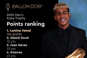 體育資訊9月27日訊 金球獎官方公布了男子科帕獎的得分細節,其中亞馬爾124分成功衛冕,以52分的優勢領先于獲得72分的杜埃,科帕獎由歷屆金球獎得主投票選出。《隊報》報道,古利特是唯一未將第一順位投給亞馬爾的評委。
