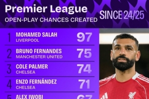全文摘要:Squawka統計英超運動戰創造機會榜,薩拉赫以97次居首,B費75次次席,帕爾74次列第三。恩佐(切爾西)、伊沃比(富勒姆)等球員緊隨其后,展現了英超球員的進攻創造力。