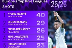 體育資訊10月17日訊 Squawka統計了本賽季到目前為止歐洲五大聯賽球員射門次數排行,皇馬前鋒姆巴佩40次射門排名第一,哈蘭德29次第二。