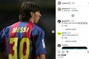 梅西發布了一張他身穿巴薩30號球衣的經典舊照,并配文寫道:“已經21年了……難以置信。”