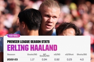 體育資訊10月17日訊 據Opta統計,哈蘭德本賽季每90分鐘射門、進球等數據創造英超生涯新高。