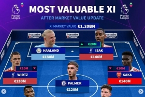 全文摘要:德轉于10月17日更新英超球員身價,并公布最貴陣。該陣容總身價高達12億歐元,由哈蘭德(1.8億歐)領銜,維爾茨(1.3億歐)、伊薩克(1.4億歐)等球星在列。阿森納和切爾西多名球員入選,展現了英超的頂級實力。